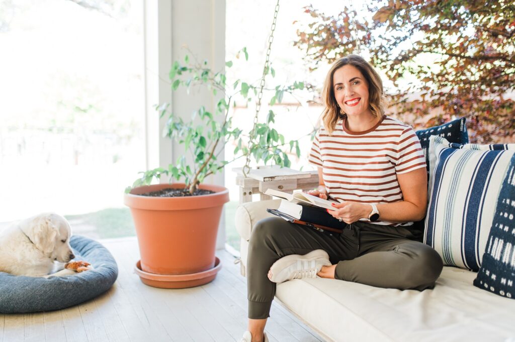 Brand photo of a woman sitting on back porch swing journaling and reading